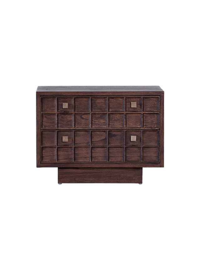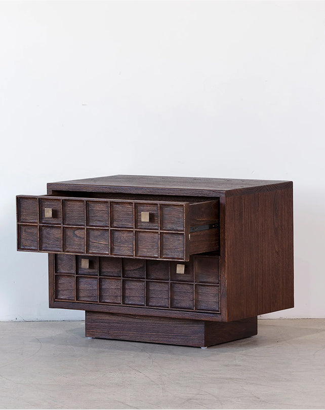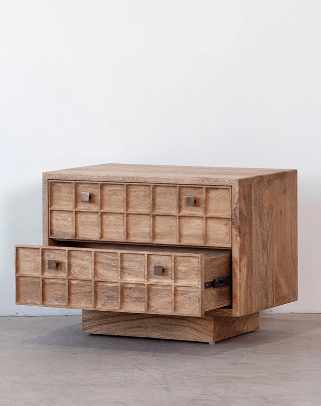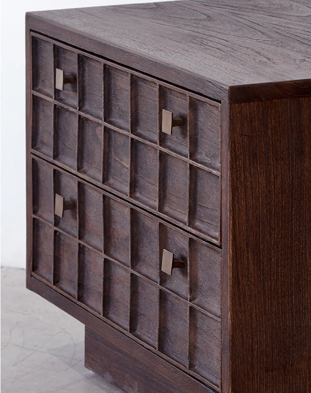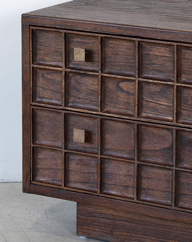 Dotées d'un magnifique motif géométrique carré sculpté à la main et de poignées carrées en laiton massif, nos tables de chevet Brutus sont fabriquées en bois de manguier massif.