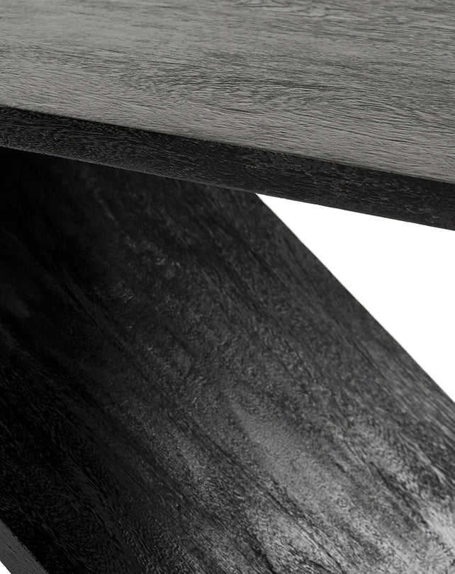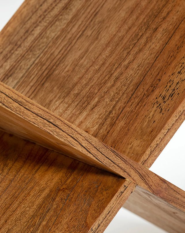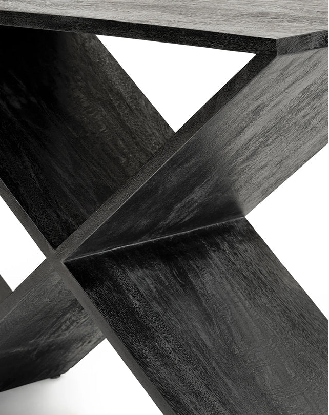 Console unique, composée de formes en losange ( 2 pieds en forme de 'X') reliées par un plateau rectangulaire en bois massif.