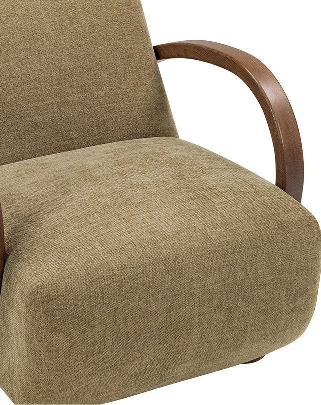 Clin d'œil au design du milieu du XXe siècle, ce fauteuil lounge rétro présente des accoudoirs en bois aux courbes élégantes et une structure en chêne sculpté. Revêtu de tissu ou de cuir, il allie le charme vintage au confort moderne.