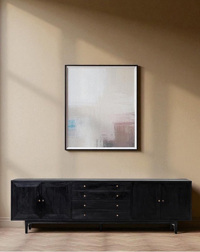 Buffet long de 2,7 mètres de long. 2 placards extérieurs avec 4 tiroirs centraux.