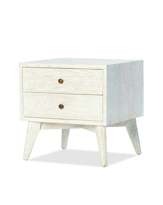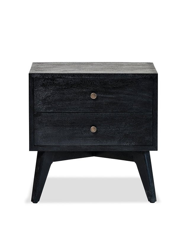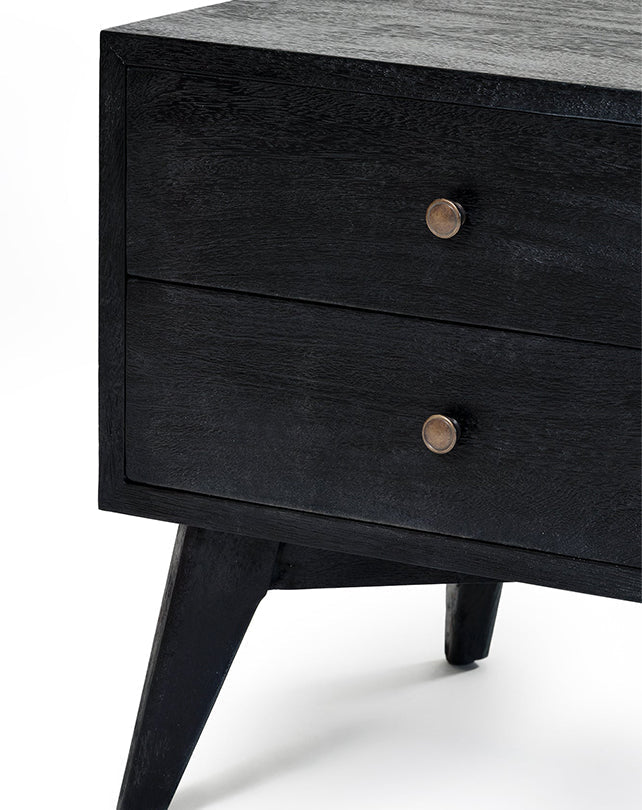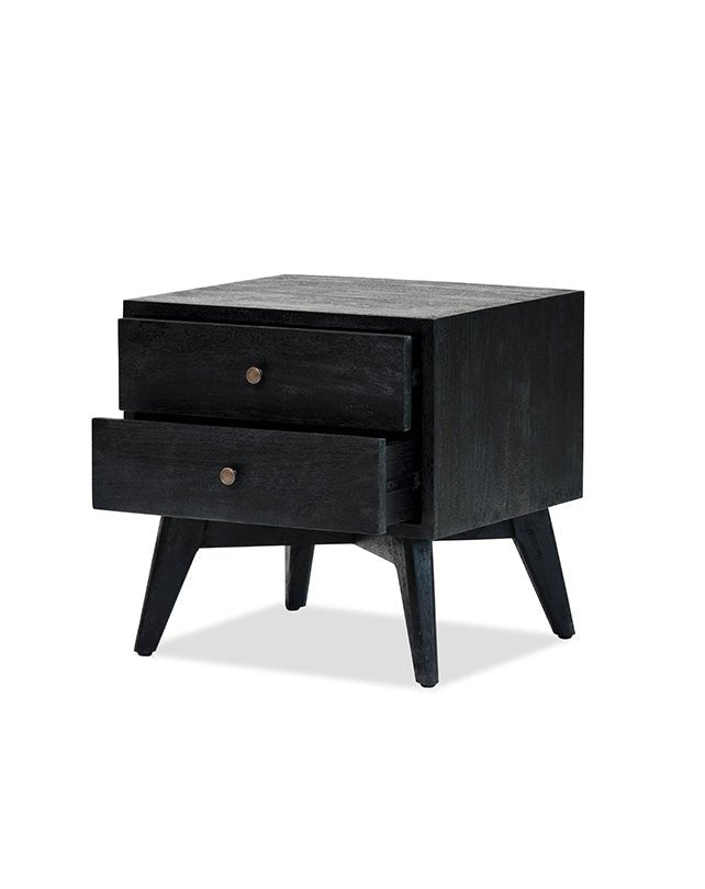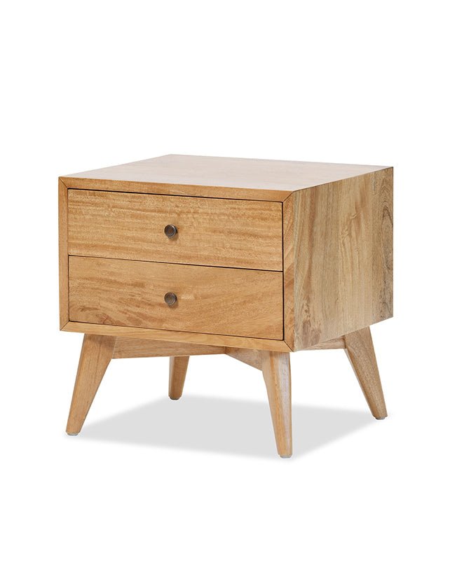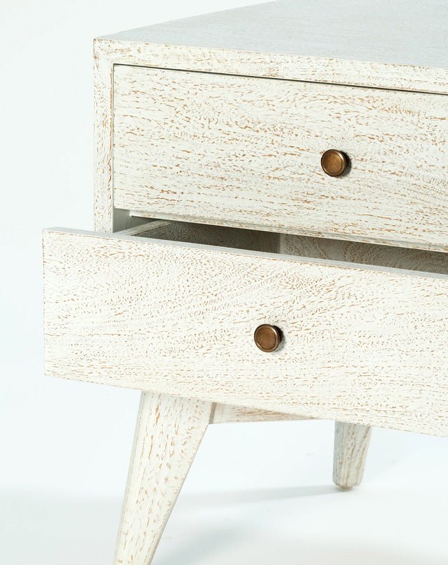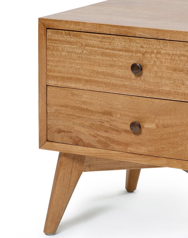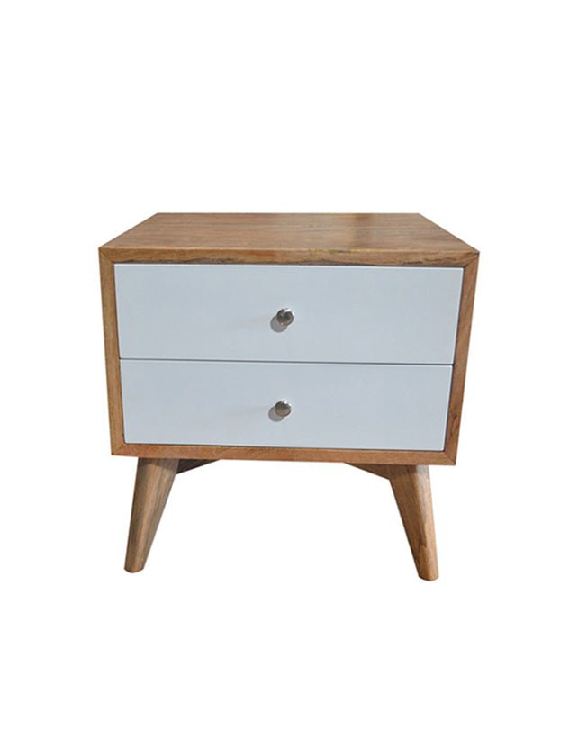 Fabriquée en bois massif, cette table de chevet d'inspiration rétro est dotée de deux tiroirs spacieux avec des poignées minimalistes. Ses lignes vintage apportent un charme intemporel à toute chambre.