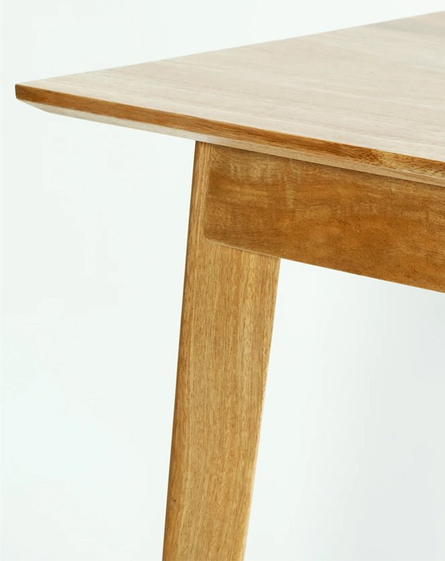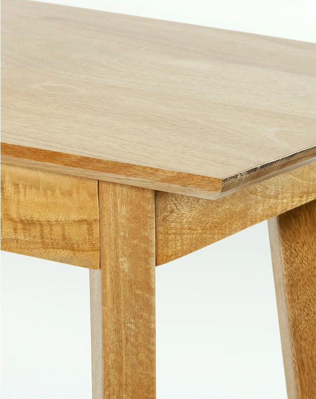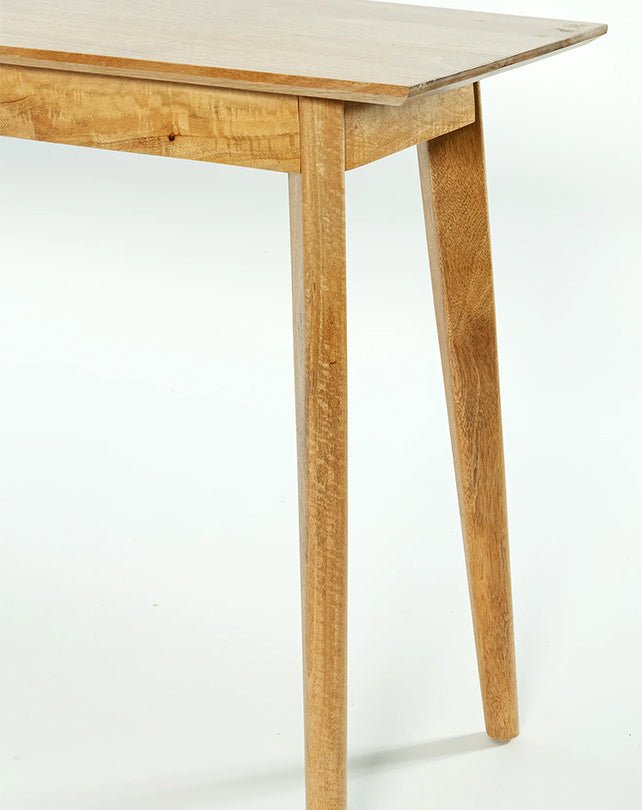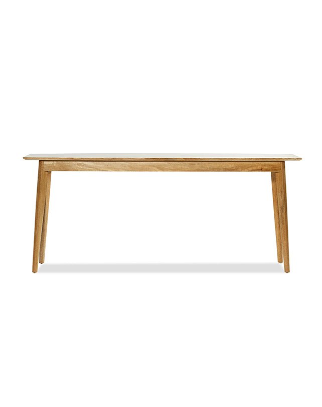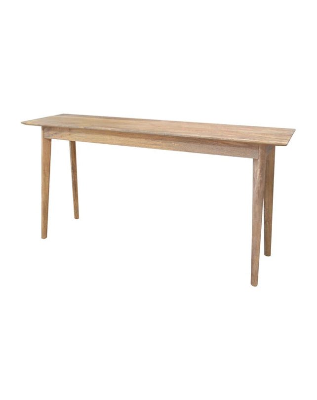 Console issue de notre collection rétro moderne. Fabriquée en bois de manguier, elle présente des pieds inclinés et un plateau fin. Disponible en quatre longueurs différentes.