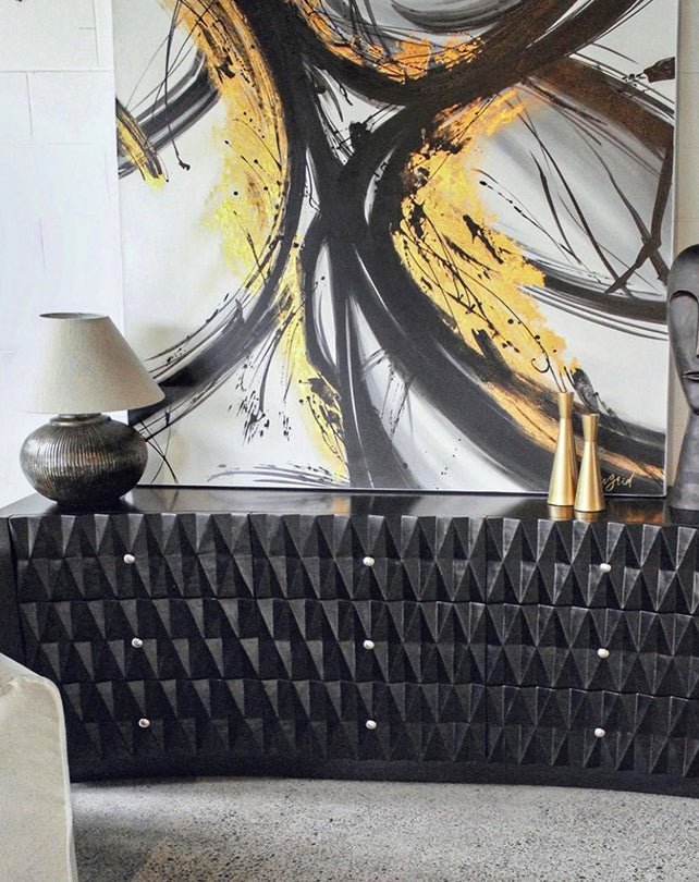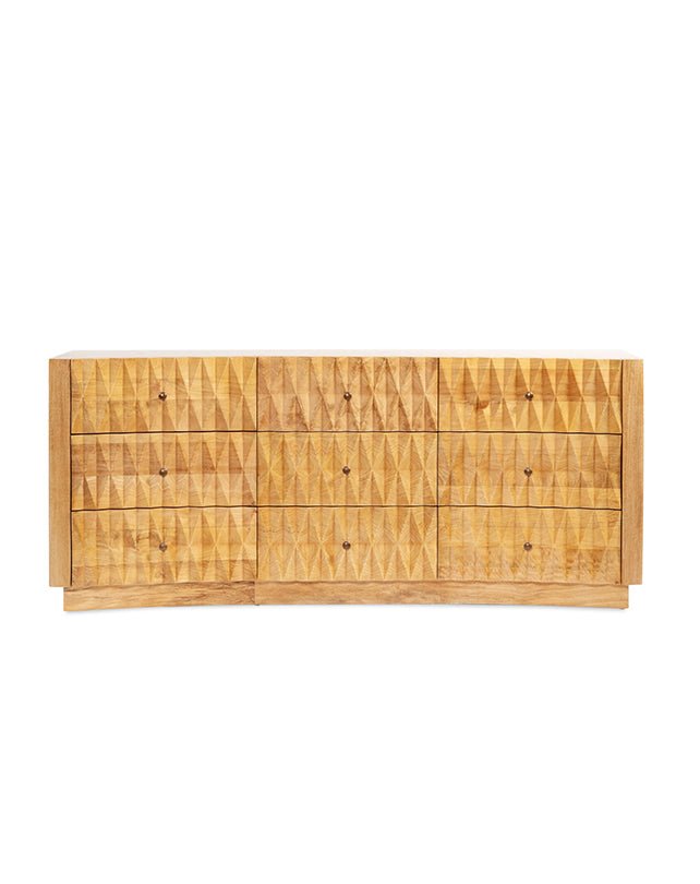 Un buffet incurvé unique aux détails raffinés. Neuf tiroirs.