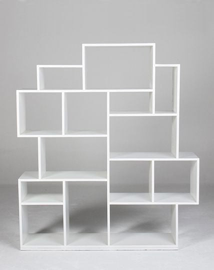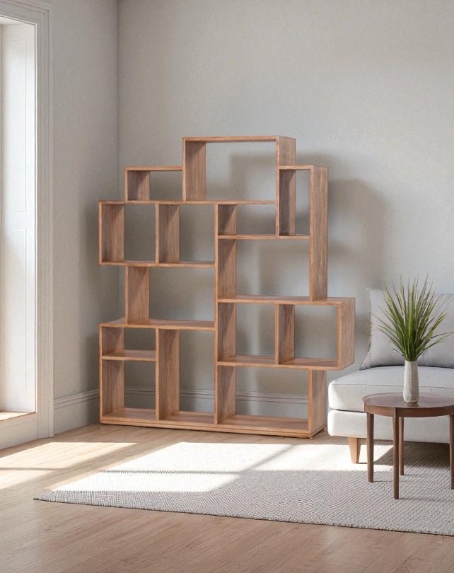 Une bibliothèque de style contemporain mais rétro, avec des étagères de différentes tailles.