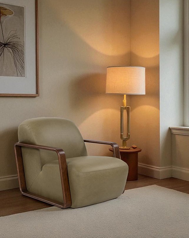 Clin d'œil au design du milieu du siècle, ce fauteuil lounge rétro présente des accoudoirs en bois aux courbes élégantes. Revêtu de tissu ou de cuir, il allie le charme vintage au confort moderne.