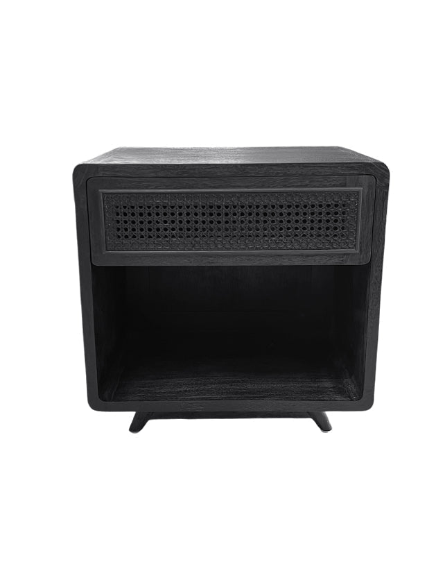 Table de chevet à un seul tiroir massif avec insert en rotin naturel et niche de rangement ouverte.