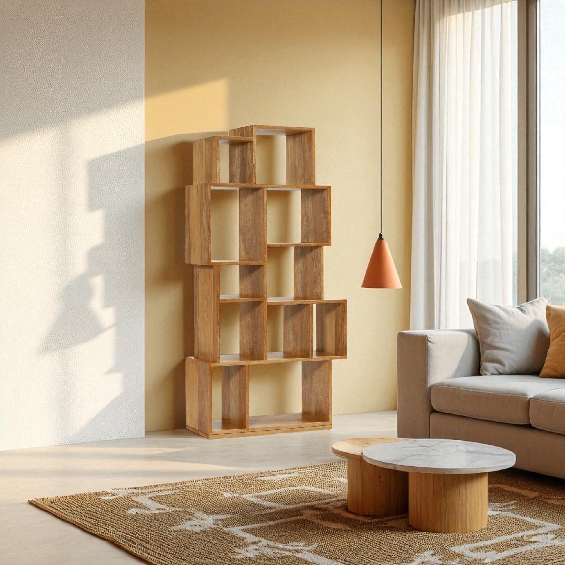Une bibliothèque de style contemporain mais rétro, avec des étagères de différentes tailles.