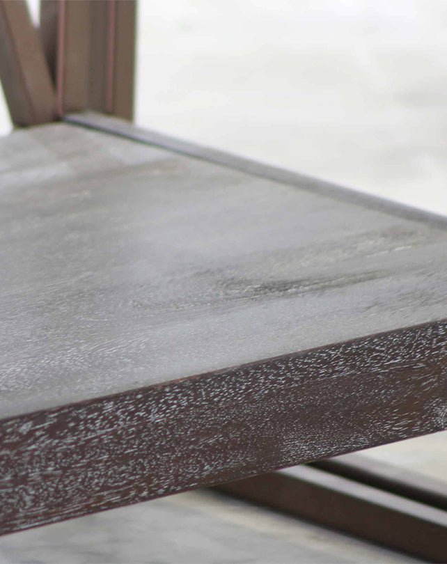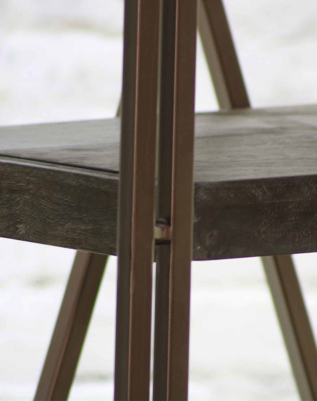 Étagère ouverte composée de planches épaisses en bois d'acacia naturel, finition sablée brun foncé. Structure en fer finition cuivre vieilli.