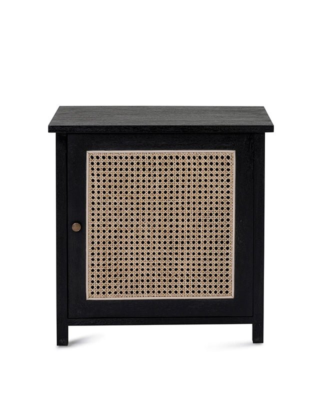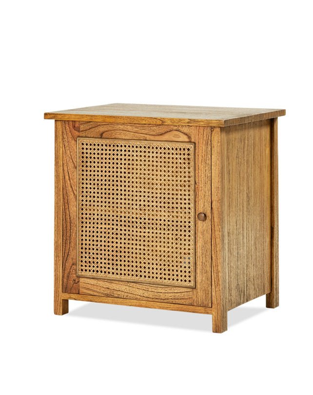 La table de chevet Willow à une porte apporte une touche de nature et d'énergie à la pièce, s'harmonisant parfaitement avec les blancs et les tons pastel évoquant la plage.